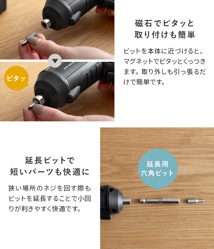 【材質】ケース本体/BMC、ドライバー本体/ABS樹脂・ゴム、ビット/CR-V