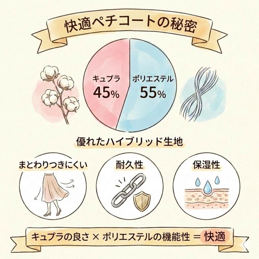 ペチコートに使用している生地はベンベルグとポリエステルの交編の<ベンベルグ>です。