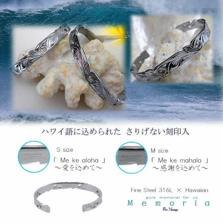 ハワイアンジュエリー ペア バングル 模様の Scroll スクロール 波 は『途切れない愛』 プルメリア 花 は『魅力』 マイレ 葉 は『強い絆』を表し、これを組み合わせたデザインは Heritage ヘリテイジ と呼ばれており『永遠に受け継がれる想い』を意味しています。本体素材は医療用のハサミやメスに使用するお肌に優しい「非アレルギー素材」 サージカルステンレス316L を使用しています。