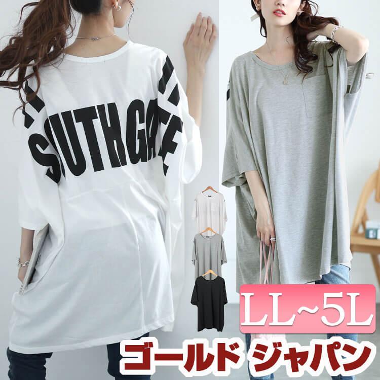 大きいサイズ レディース チュニック Tシャツ トップス バックプリントドルマンチュニックTシャツ カットソー ロゴTシャツ ロゴT オーバーサイズ ロゴ ドルマン ストレッチ 春新作 春服 夏服 秋服 LL 2L 3L 4L 5L ブラック 黒 オフホワイト 白 杢グレー ゴールドジャパン
