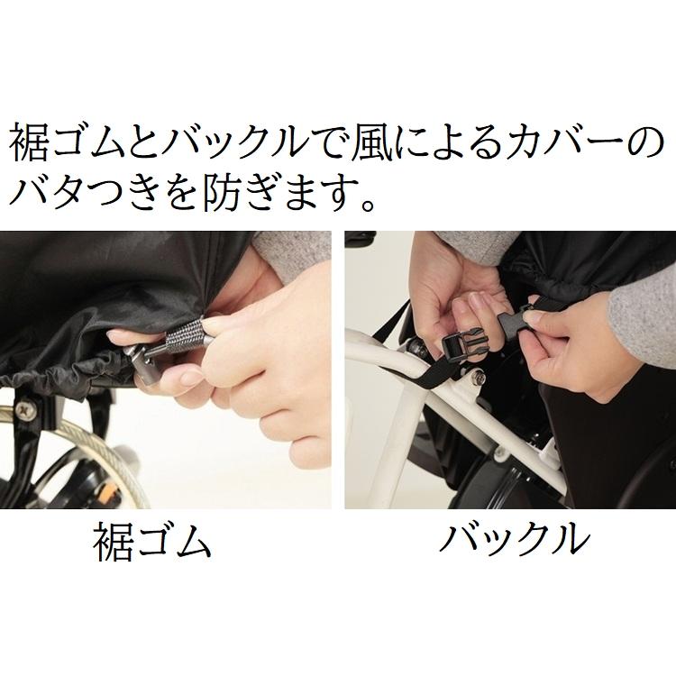 裾ゴムと前方のバックルを留めることにより風によるカバーのバタつきを防ぐことができます。