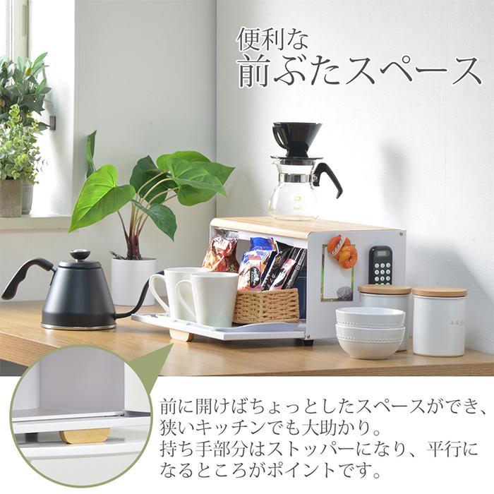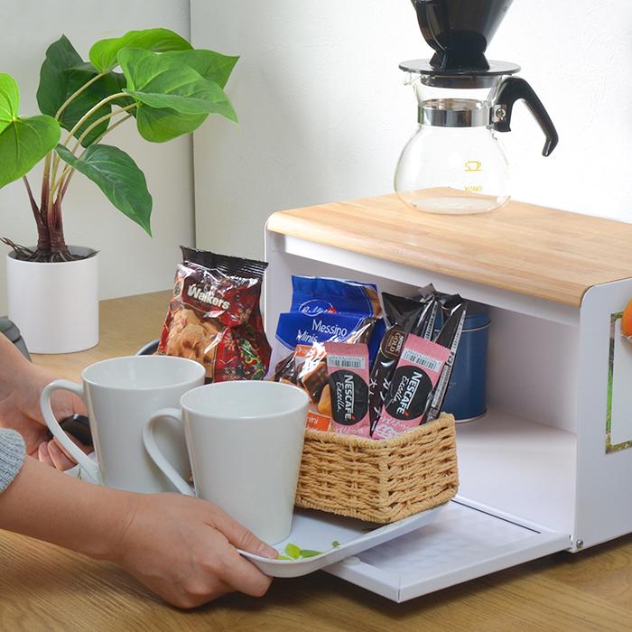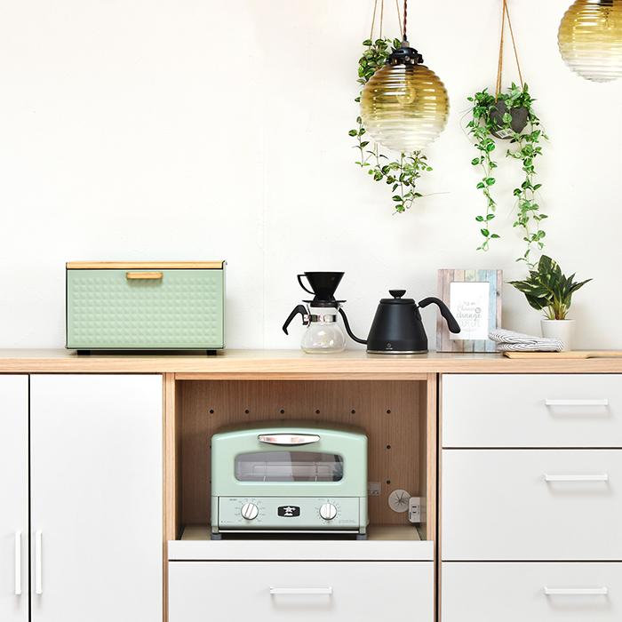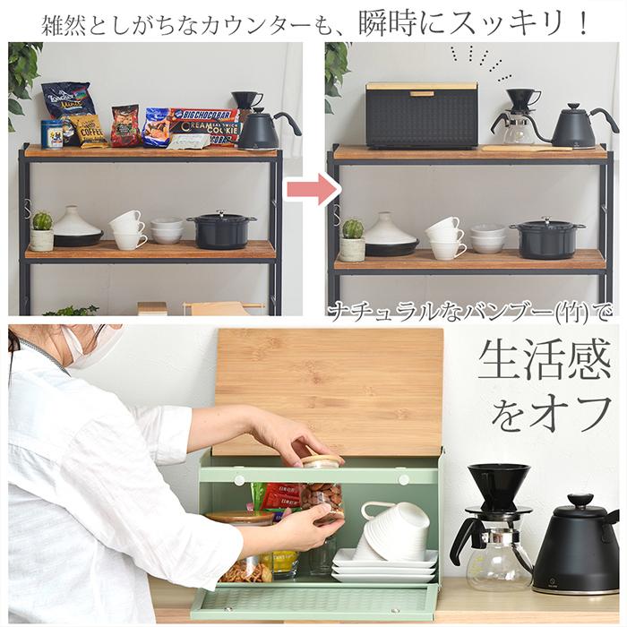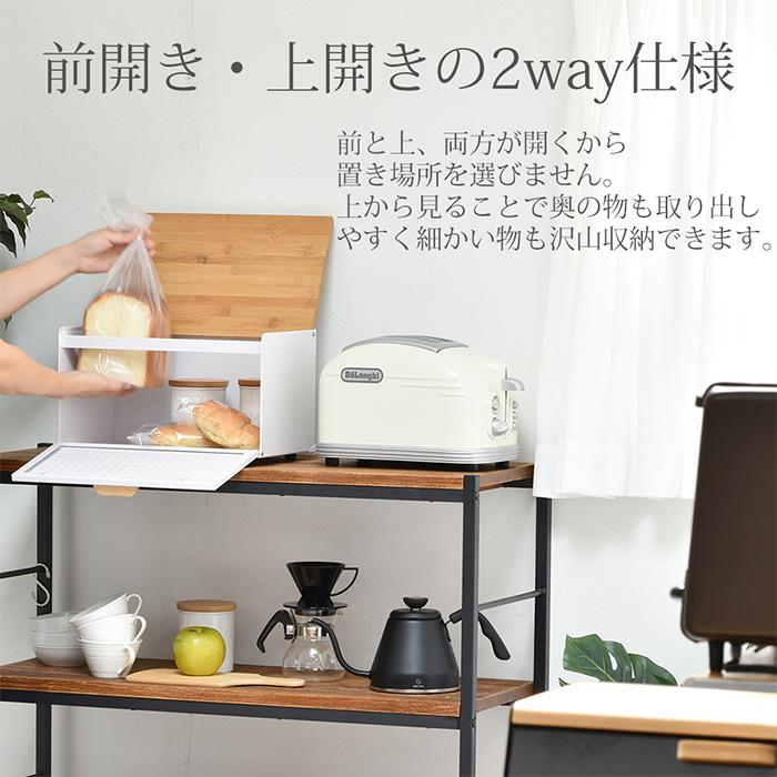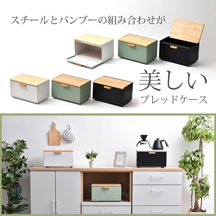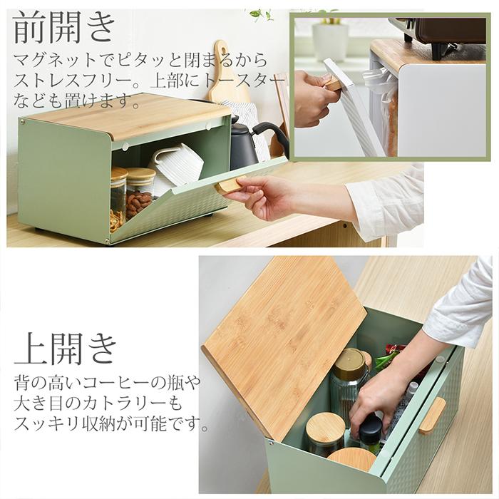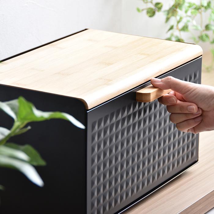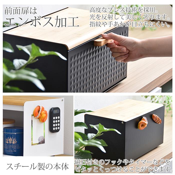 シンプルで大容量のブレッドケースどんなキッチンにも溶け込み、おしゃれに生活感をオフしてくれます。前開き・上開きの2way仕様でストレスフリーに使えます。上にトーストを置くこともできます。【素材】本体:スチール、マグネット天板・取っ手:バンブー集成材【サイズ】外寸:(約)横33.5×奥行23.5×高さ21cm内寸:(約)横35×奥行20×高さ17.5cm ブレッドボックス トースター パン パン入れ シンプル ブラック ホワイト おしゃれ かわいい