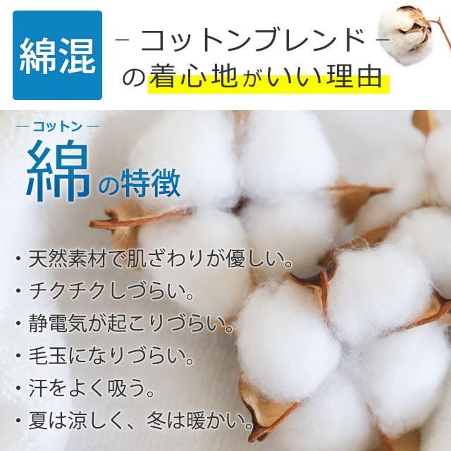 なめらかで、やさしい肌触りにこだわった綿混だからチクチク感が苦手な方も心地よく着られる。