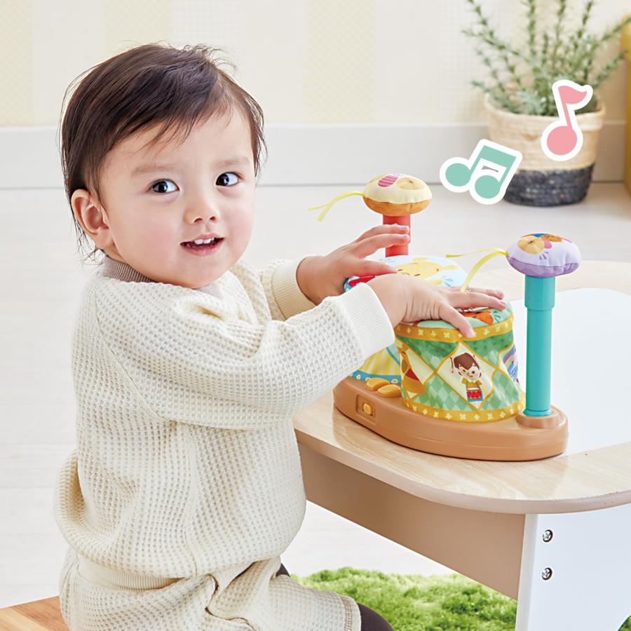 たたいて・つかんで・ひっぱって!赤ちゃんのおててで、簡単に演奏が楽しめる布製のドラムです。