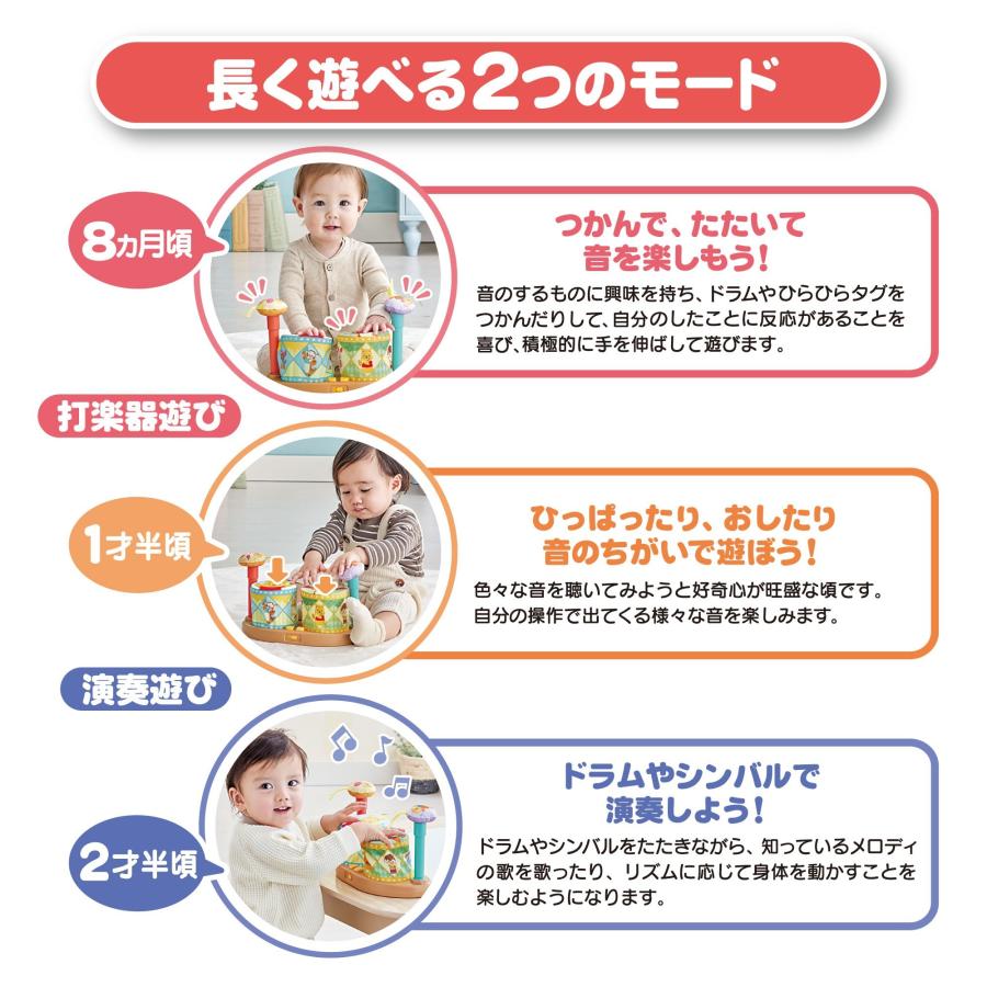 ・メロディに合わせてドラムやシンバルをたたいて演奏遊びができます。