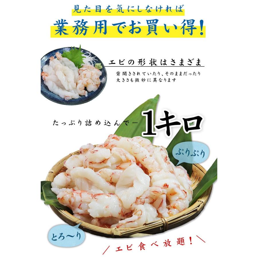 お刺身鮮度でぷりっぷり!甘みたっぷりの天然赤エビをたっぷり1kg!殻・背ワタ取り済みなので可食部ほぼ100%。加熱調理でも、旨みが凝縮され甘みが増して絶品!形や大きさが不揃い・身が欠けていたりする訳あり品ですが、その分業務用でずっしり詰め込んでお買い得!お刺身や海鮮丼、炒め物やパスタの具などにも手軽に使えます。