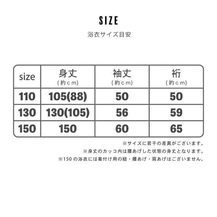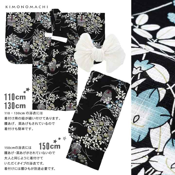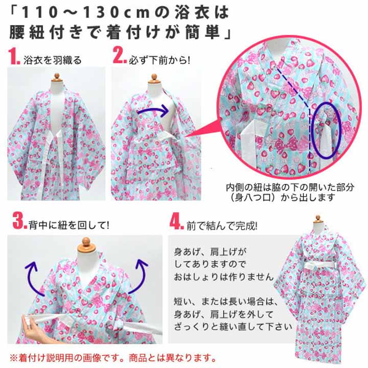 110cm、130cmの浴衣には着付け用に紐が縫い付けられていて、身あげ、肩上げがされています。150cmは大人と同じように着付けていただく仕様です。