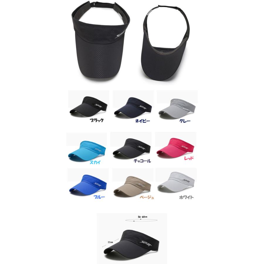 スポーツバイザー メッシュ 日よけ ランニング アウトドア 観戦 サンバイザー 帽子 速乾 通気性 メンズ レディース 9カラー 【商品情報】◎ポリエステル素材の速乾性キャップ。◆総重量53グラムのメッシュデザインは軽くて持ち運びにも便利なアイテムです。◆紫外線や雨風を防ぐのに便利なデザインです。◆ツバはプラスチック製芯材入りで型崩れの心配がありません。◆夏場のスポーツ観戦にもおススメのアイテムです。■サイズ:F(ユニセックス)頭周り約55〜60センチ、つば長さ7センチ
