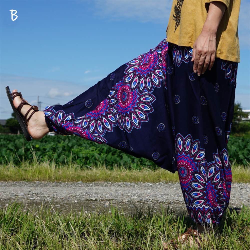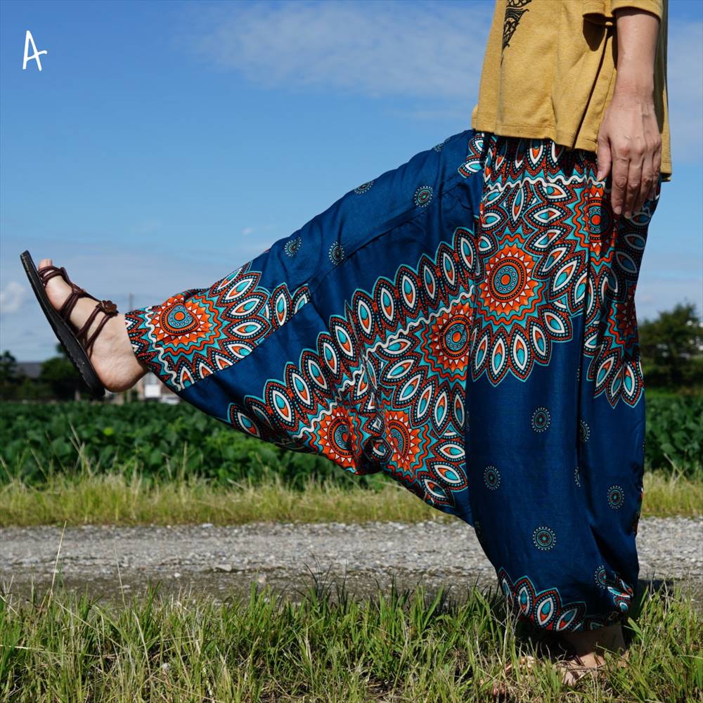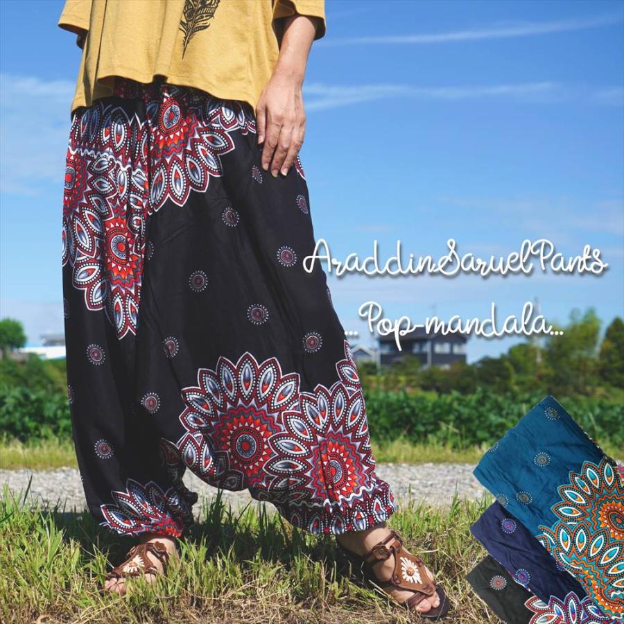 まるでお花のよう♪色あざやかなマンダラデザインがおしゃれなサルエルパンツです。初めてさんでも使いやすいカジュアルエスニックデザイン!一度履いたらクセになる軽くて滑らかな肌ざわり、お腹やヒップ・足元まですっぽりとサイズ感を気にせず楽しめるゆったり着心地のパンツです。すとんとした生地の落ち感やナチュラルなたわみが美シルエットのポイント!!素材にはさらっと風通しのいいレーヨン生地を使用、レイヤーアレンジなどでロングシーズン楽しめます。ウエスト&足元はストレッチ抜群のシャーリング仕立てでユニセックス使いもおすすめ◎暑い時期はサロペットとして2Wayアレンジもぜひお楽しみ下さい。