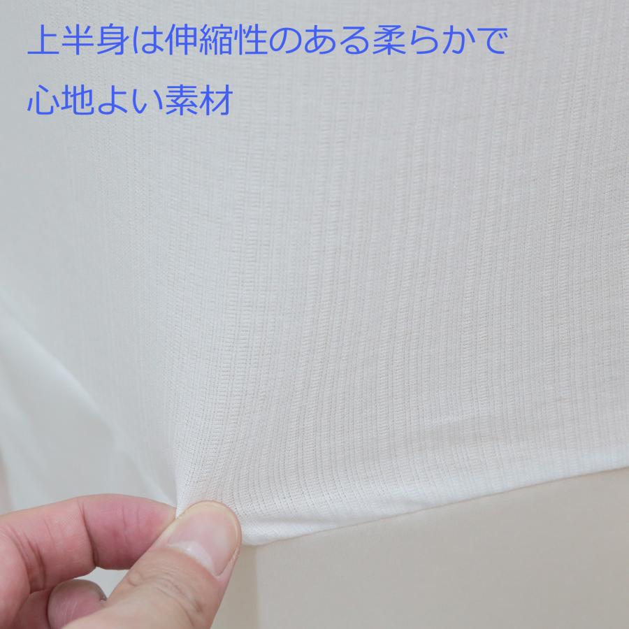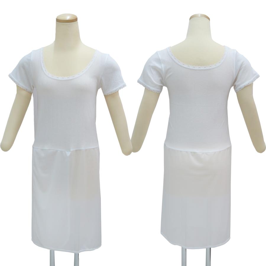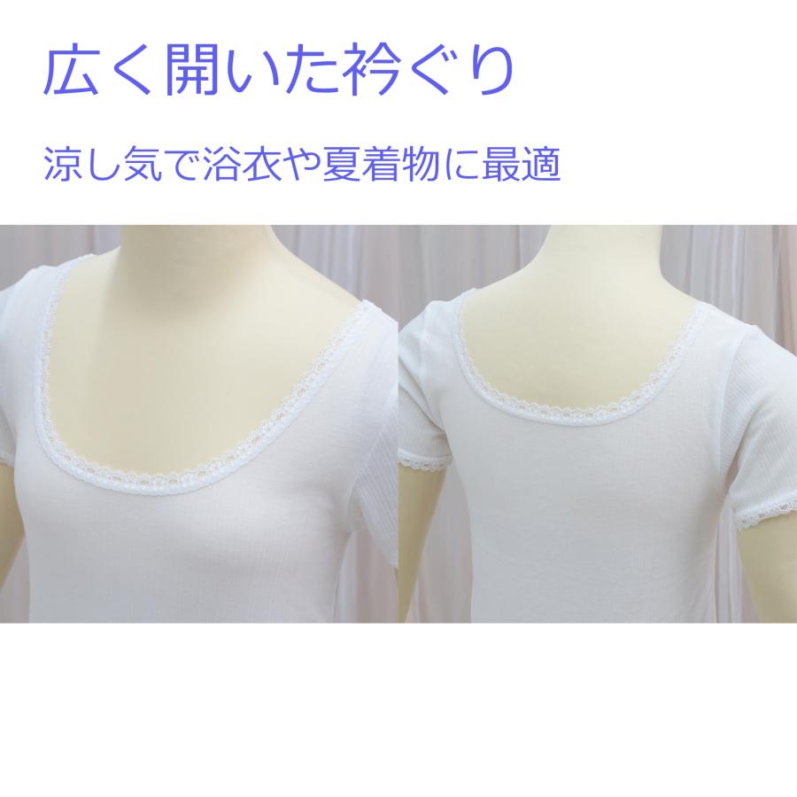 衿と袖まわりにはお洒落なレースがあしらわれています。大きく開いた衿ぐりなので浴衣などにも最適です。上半身は伸縮性があり身体にフィットする心地よさと汗を吸収しながら放湿してくれます。裾廻りは巻きスカートのような構造になっていて足にまとわりつきにくいサラサラとした素材で歩きやすく快適です。日本製で素材や縫製もしっかりしており機能性もあるのでとても重宝してお使いいただけること間違いなし。涼しさを感じながら、夏の和装を楽しんでください!