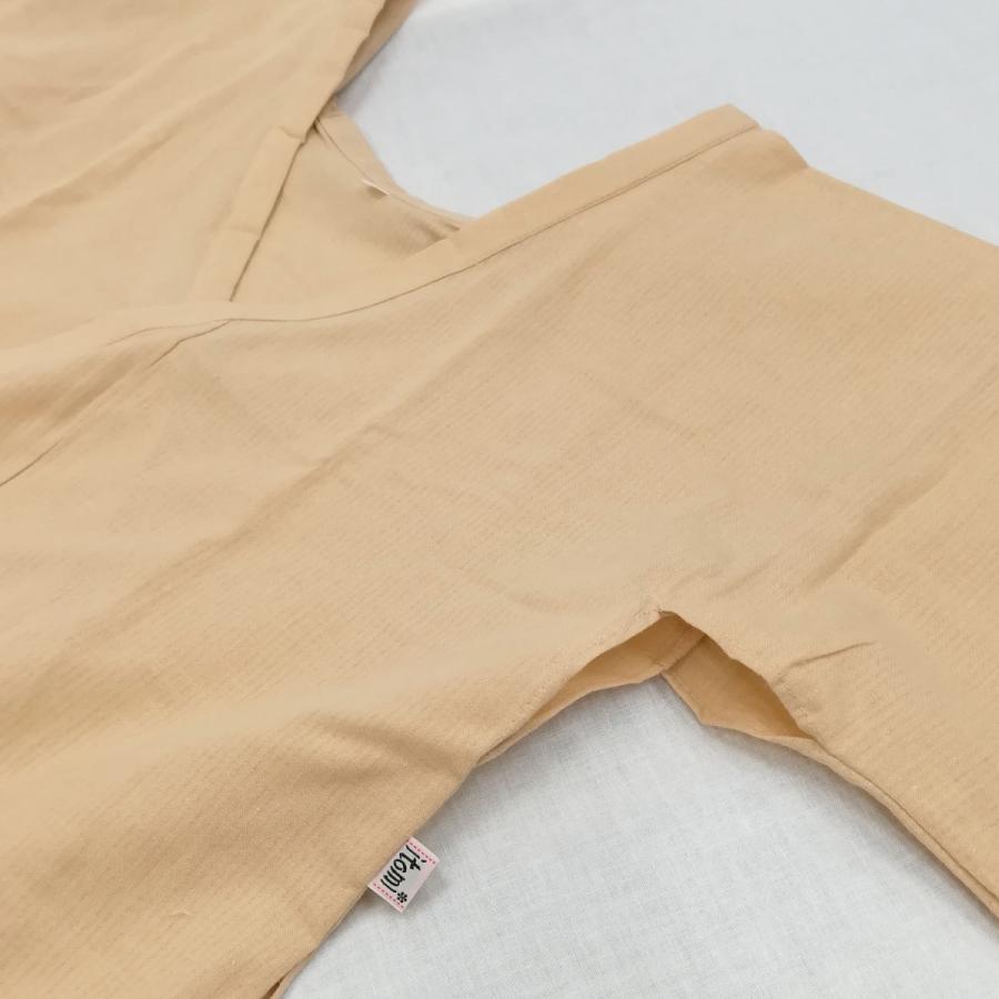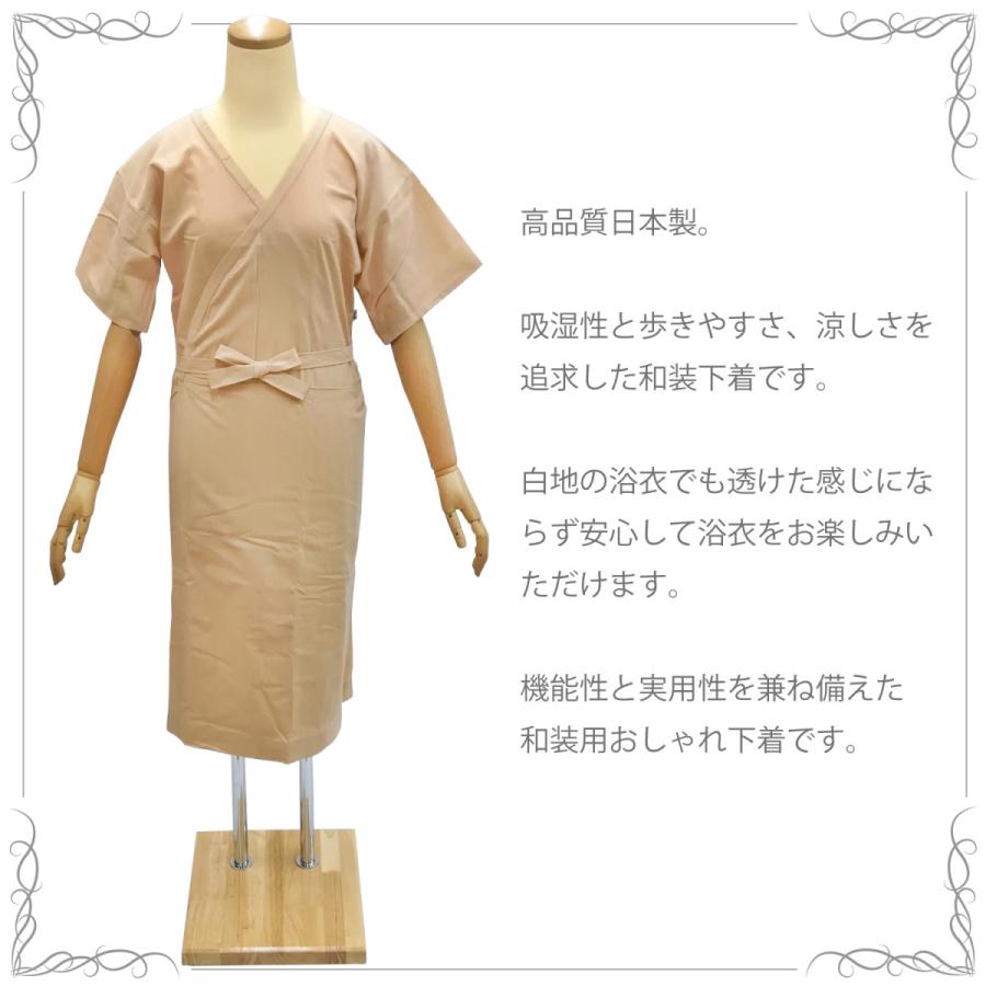 肌に近い色なので、白地の浴衣を着た時も透けにくく安心して浴衣をお召いただけます。肌襦袢と裾除けが一体になったワンピースタイプですので、さっと羽織って紐を結ぶだけで簡単に着られます。
