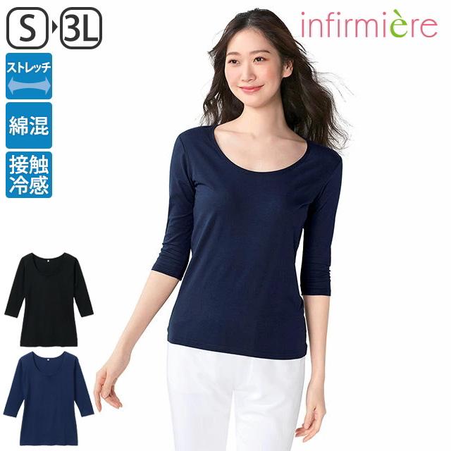スクラブインナー 七分袖 夏 接触冷感 綿混 レディース 女性 7分袖 スクラブ 白衣 ナース服 医療 アンファミエ ひんやりコットンスクラブインナー