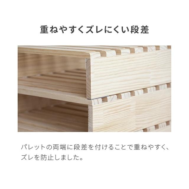 おすすめポイント:組み換え自由なパレット、工具いらずの簡単組み立て、風通しの良いすのこ板