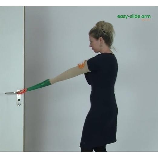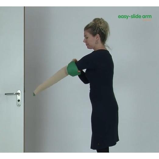アームスリーブは片手で装着しなければならないためその苦労は下肢以上です。『イージースライド アーム』のオレンジ色の先端部分をドアノブなどの出っ張りに引っ掛けると抜き出しやすくなります。脚用と同じ滑りやすい素材を使用し、片手で装着しやすい設計です。