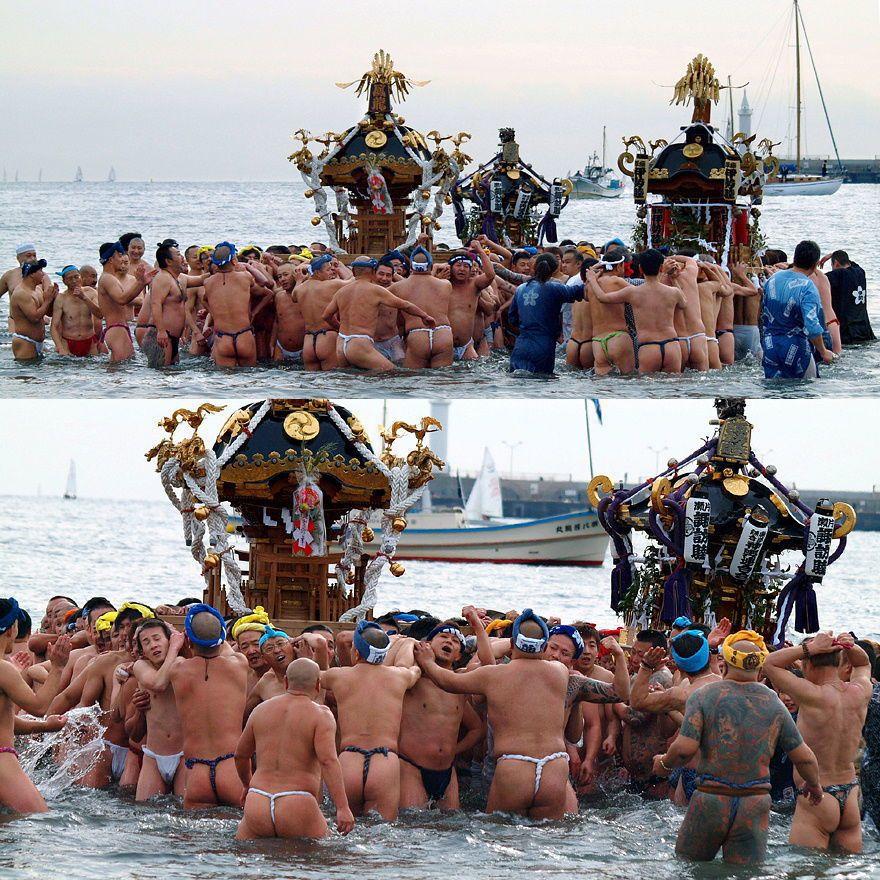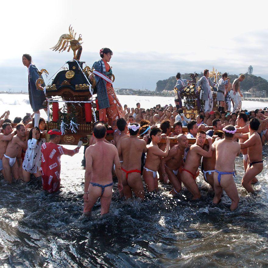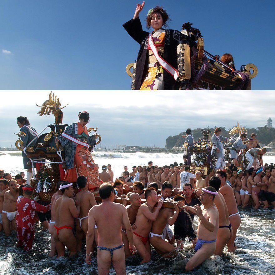 かつては、成人式を迎えた20歳の男女が神輿に乗って海上渡御を行い、晴れて成人の仲間入りを果たす通過儀礼でしたが、近年はどこの神社も神輿の上に乗ることを禁じるようになり、祭祀を司る江島神社(えのしまじんじゃ)もその例外ではなくなり、新成人が神輿の上に乗って海上渡御する姿はまったく見られなくなっていました。