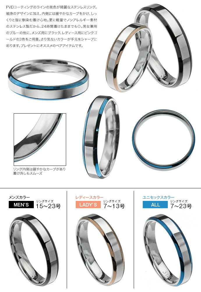 PVDコーティングのラインの発色が綺麗なステンレスリング。細身のデザインに加え、内側には緩やかなカーブをかけ、しっくりと指に馴染む着け心地。更に軽量でノンアレルギー素材のステンレス製だから、24時間着けたままでも◎。男女兼用のブルーの他に、メンズ用にブラック、レディース用にピンクゴールドの3色をご用意。さり気ないカラーが手元をシャープに彩ります。プレゼントにオススメのペアアイテムです。
