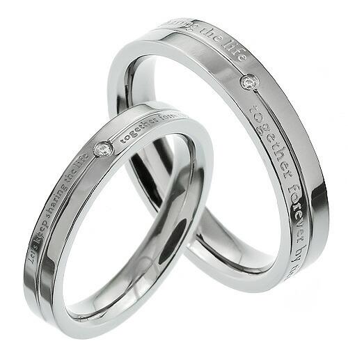 リング中央を走るラインとクリアカラーのジルコニアがクールな印象のステンレスペアリングです。ラインを挟んだ上下には「Let's keep sharing the life together forever by ties of love(強い愛の絆でずっと一緒にいよう)」というメッセージが刻印されています。2つのリングを合わせるとハートの形が浮かび上がる、そんなペアアクセならではの趣向も嬉しいアイテムです。