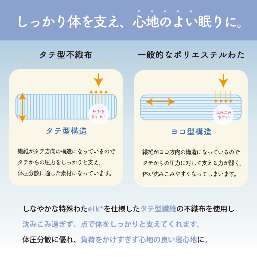 中材:ポリエステル70%・複合繊維(ポリエステル)30% / 帝人フロンティアのタテ型不織布「V-Lap」を使用