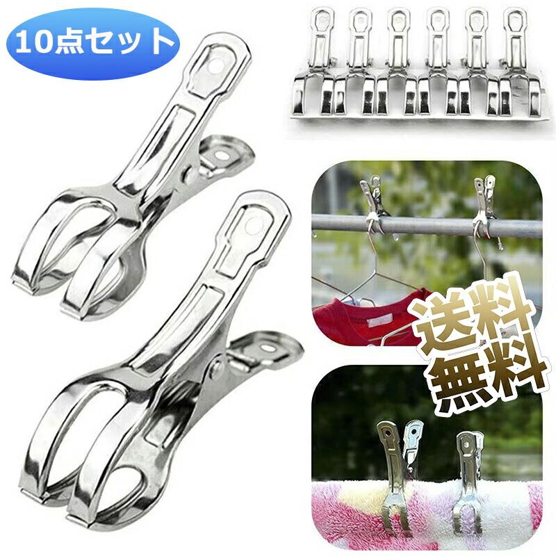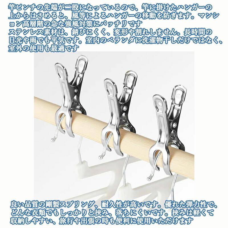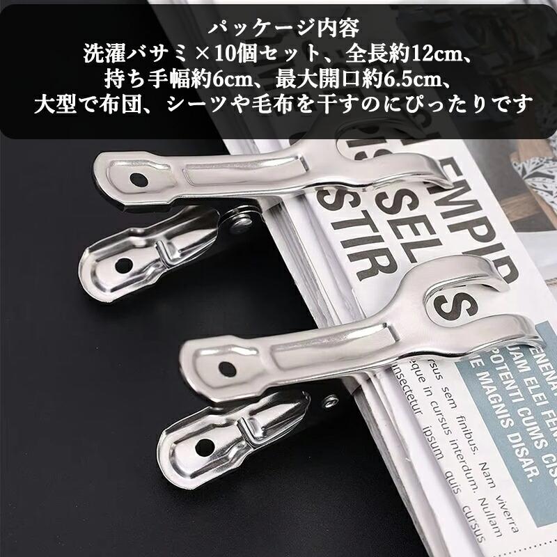 パッケージ内容:洗濯バサミ×10個セット、全長約12cm、持ち手幅約6cm、最大開口約6.5cm、大型で布団、シーツや毛布を干すのにぴったりです竿ピンチの先端が二股になっているので、竿に掛けたハンガーの上からはさめると、風等によるハンガーの移動を防ぎます。マンション高層階の急な強風対策にバッチリですステンレス素材は、錆びにくく、変形や割れしません。長時間の日光や雨でも平気です。室内のベランダに洗濯物干しだけではなく、室外の使用も最適です良い品質の剛製スプリング、耐久性が高いです。優れた弾力性で、どんな衣類でもしっかりと挟み、落ちにくいです。挟みは軽くて収納しやすい、旅行や出張の時も便利に使用いただけます