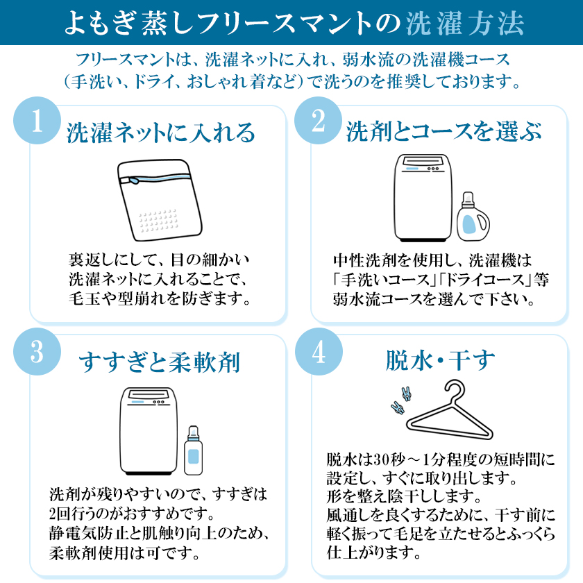 着用時に感じる冷っとした感触や、汗でべとつく感覚とは無縁のフリース素材の【じゃぶじゃぶ洗える よもぎ蒸しマント】は、業務利用・家庭用ともにオススメできます。