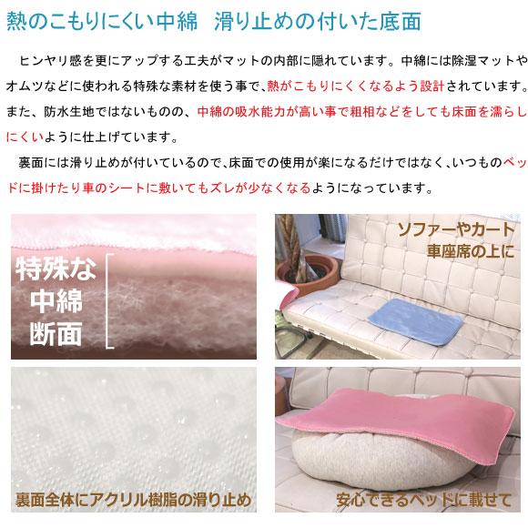 ●素材表地レーヨン52% ナイロン48% 接触冷感値Q-MAX0.3以上裏地ポリエステル100%+滑り止め樹脂部分アクリル系100%●生産国:日本ひんやりマット ペットクールマット 冷感マット 涼感 犬用 猫用 小型犬 中型犬 熱中症対策 暑さ対策グッズ 洗濯可能 軽い 持ち運び 折りたたみ ウォームハートカンパニー WHCY