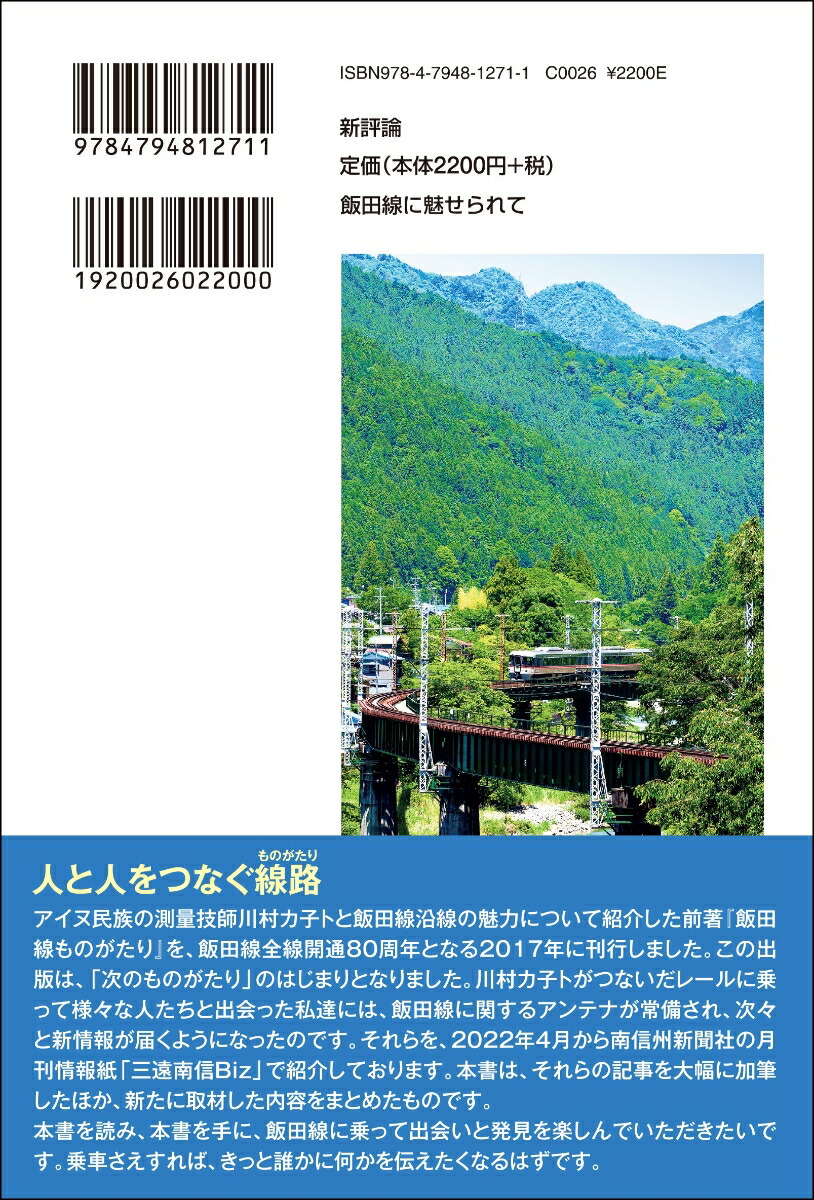 人と人をつなぐ線路。アイヌ民族の測量技師川村カ子トと飯田線沿線の魅力について紹介した前著『飯田線ものがたり』を、飯田線全線開通80周年となる2017年に刊行しました。この出版は、「次のものがたり」のはじまりとなりました。川村カ子トがつないだレールに乗って様々な人たちと出会った私達には、飯田線に関するアンテナが常備され、次々と新情報が届くようになったのです。それらを、2022年4月から南信州新聞社の月刊情報紙「三遠南信Biz」で紹介しております。本書は、それらの記事を大幅に加筆したほか、新たに取材した内容をまとめたものです。