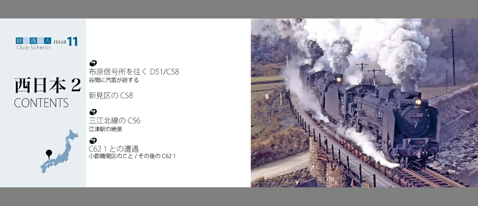 特集1 布原信号所を往くD51/C58-谷間に汽笛が谺する/新見機関区とC58/特集2 三江北線のC56-江津駅の絶景/特集3 C62 1との遭遇ー小郡機関区のこと/その後のC62 1