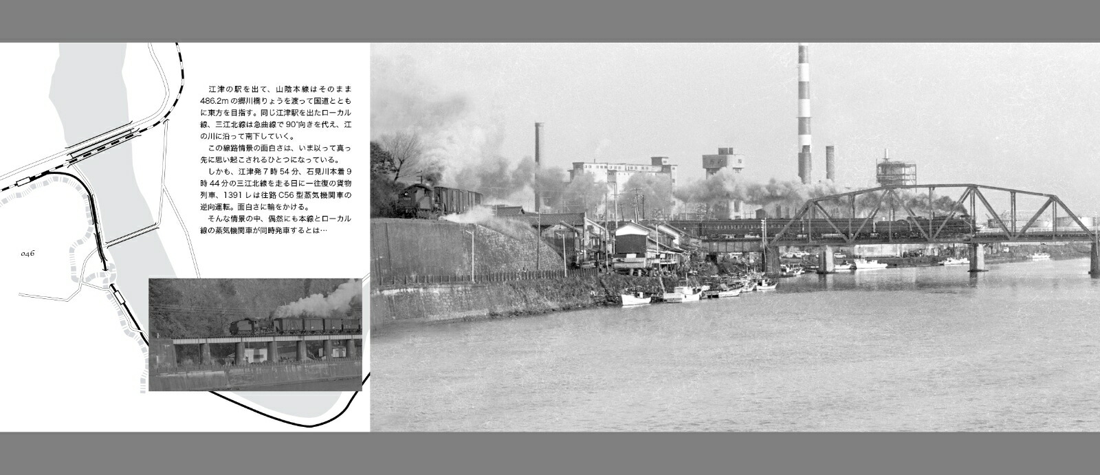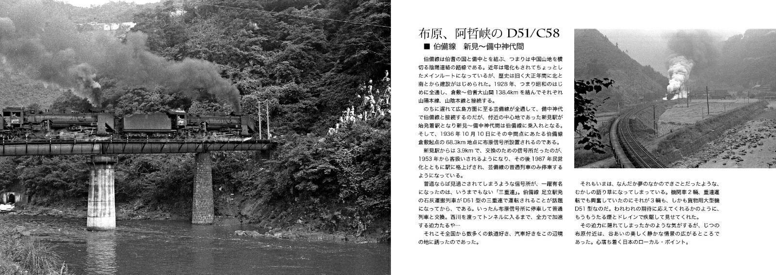 佳き時代の鉄道情景をいくつかの特集形式でまとめる。蒸気機関車の晩年、ブームのようになっていた頃の話題のひとつにD51三重連があった。伯備線、その舞台でもあった布原は、じつは三重連の喧噪とは裏腹に、日本的情景が広がる静かな谷間にあった。三重連とともにもうひとつの布原の魅力にスポットを当てる。鉄道の街、新見の大きな機関庫とそこに所属するC58型を特集する。もうひとつは、鉄橋で人家すれすれに走るという珍しい情景、そこを走る逆向C56という奇跡のようなシーンを記録。鉄道好きのみならず、地方の史実としても興味深い。第3特集として小郡機関区で遭遇したC62 1の姿と保存後の近況まで。