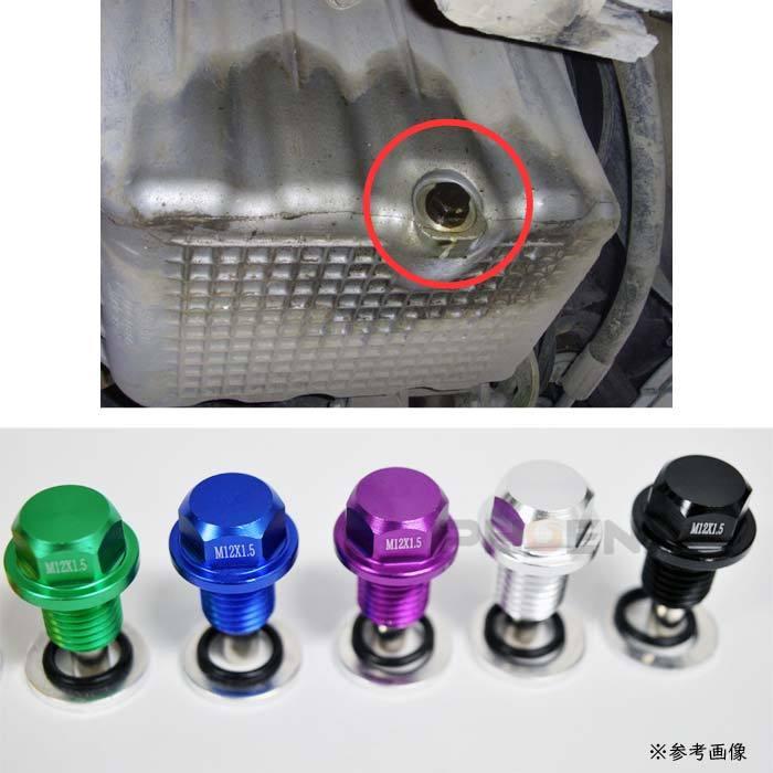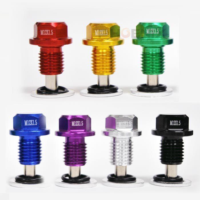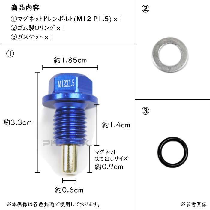 No-7715■商品内容:マグネットドレンボルト x1 ガスケット x1 Oリング x1■カラー:ブラック シルバー レッド イエロー ブルー グリーン パープル■サイズ:画像をご確認ください。■適合:汎用■ボルトサイズ:M12 P1.5■マグネット突き出しサイズ:約0.9cm■材質:アルミ合金●磁石の特性を利用して、オイルタンク内のスラッジや鉄粉を吸着するドレンボルトです。※マグネット部分が内部に干渉しないことを予めご確認の上、ご購入ください。