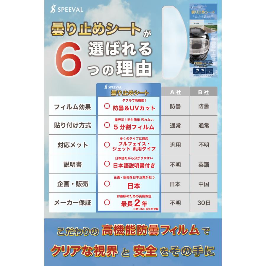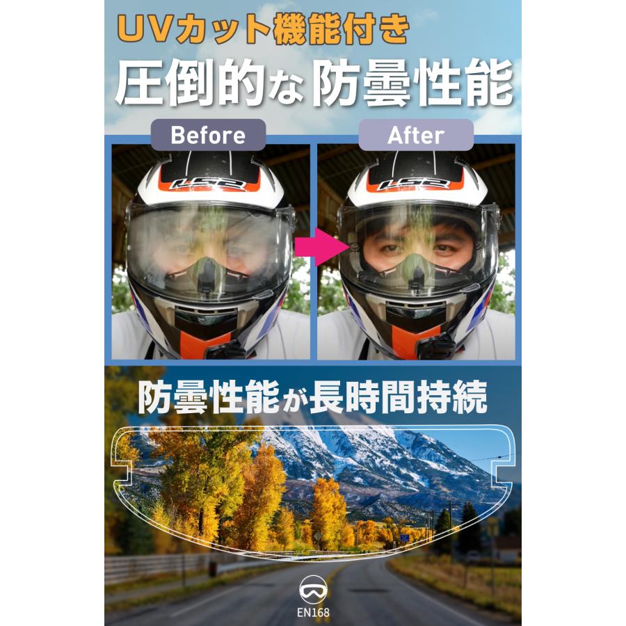 ●【 クリアな視界を保つ防曇効果 】 他社製品とは異なり、シートに曇り止めコーティングがされているのではなく、シート自体が曇り止め効果を持つ素材になっている為耐久性が優れています。