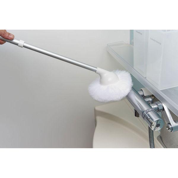 網目状の繊維で水だけで石鹸カス汚れやヌメリをしっかりかき取るお風呂掃除用のブラシ。お風呂場の床、壁、浴槽、天井すべて1本でお掃除できます。網目繊維は柔らかいため、お風呂のシリコーキング部分を傷つけることなくお掃除可能です。ふさふさの繊維のため、あらゆる隙間に穂先が届きます。50〜73cmまで伸縮する柄により、浴槽の底や天井も腰を曲げずに楽にお掃除が可能です。抗菌加工を施しているため、清潔に保つことが出来ます。お風呂場のカビ防止に最適な水切り抜群のワイパースクイジーとのセット。