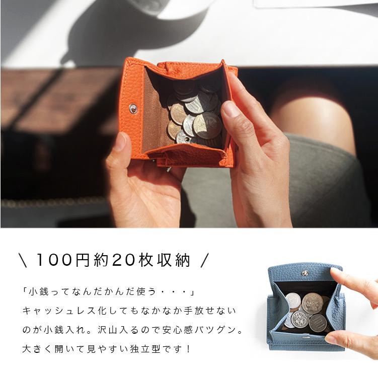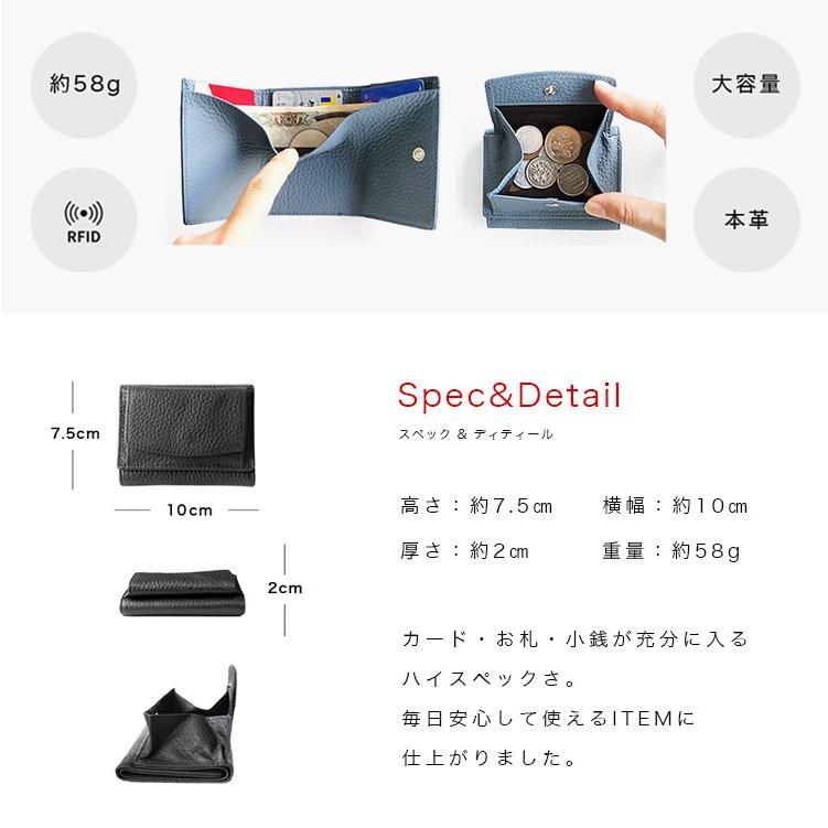 手の平サイズのシンプルなデザインに十分な収納を備え、かさばらないコンパクトさは小さめのバッグやポケットに入れて出かけるには丁度いいサイズ感になっています。マチ付きで大きく開く小銭入れは収納力はもちろん見易く出し入れもし易い構造になっています。素材として使用しているレザーは爪やコインでひっかいても傷がつかない優れた耐久性を持つ「安心感」のある素材になっており、磁気防止の特殊な生地を採用することでスキミング防止機能を備えていますので、普段使いにも安心してお使いいただけます。