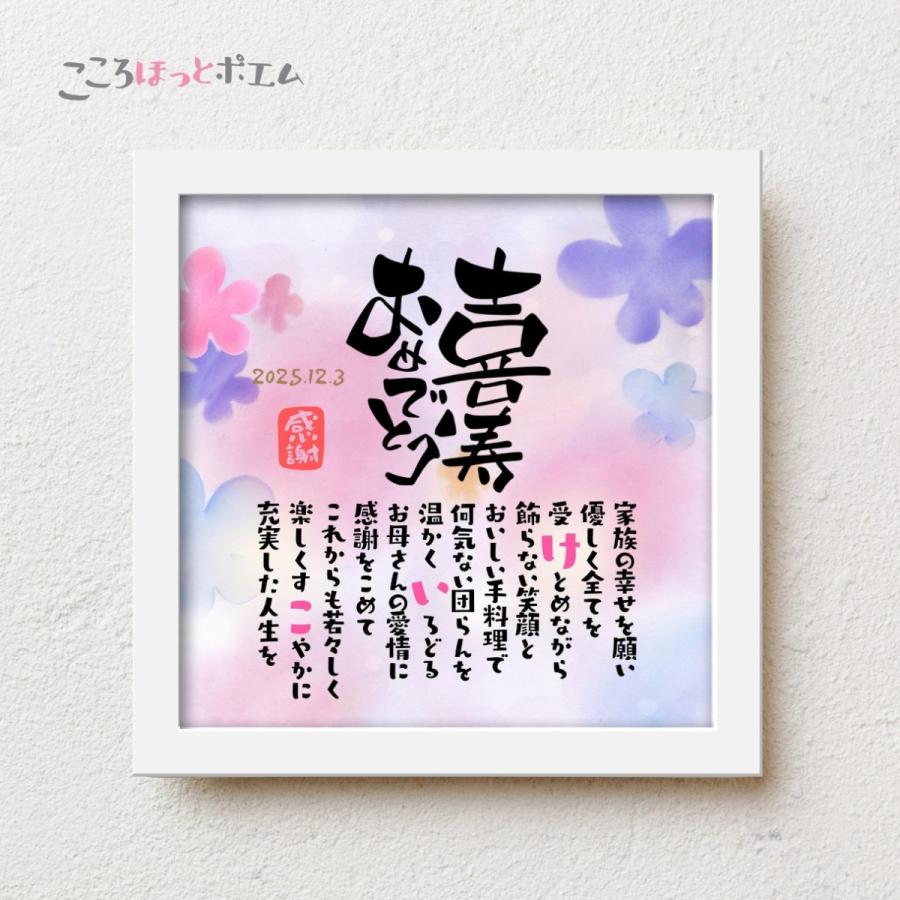 喜寿祝いの贈りものとして、お父さんやお母さんへの感謝の気持ちをお名前を入れた素敵なポエムにします。