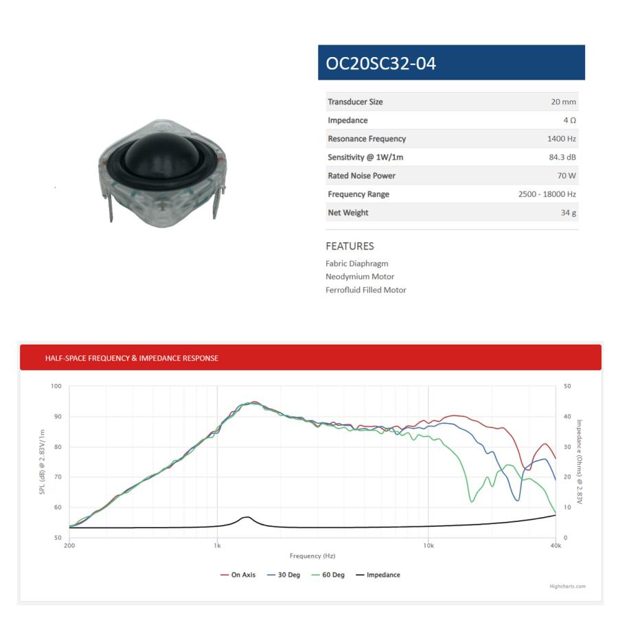 一応仕様上のスペックは18kHzとなっておりますが、特性グラフをご覧の通り0度の直線上においては20kHz以上出ておりますので、ハイレゾ対応スピーカーの製作にもお使いいただけるツイーターユニットとなっております。