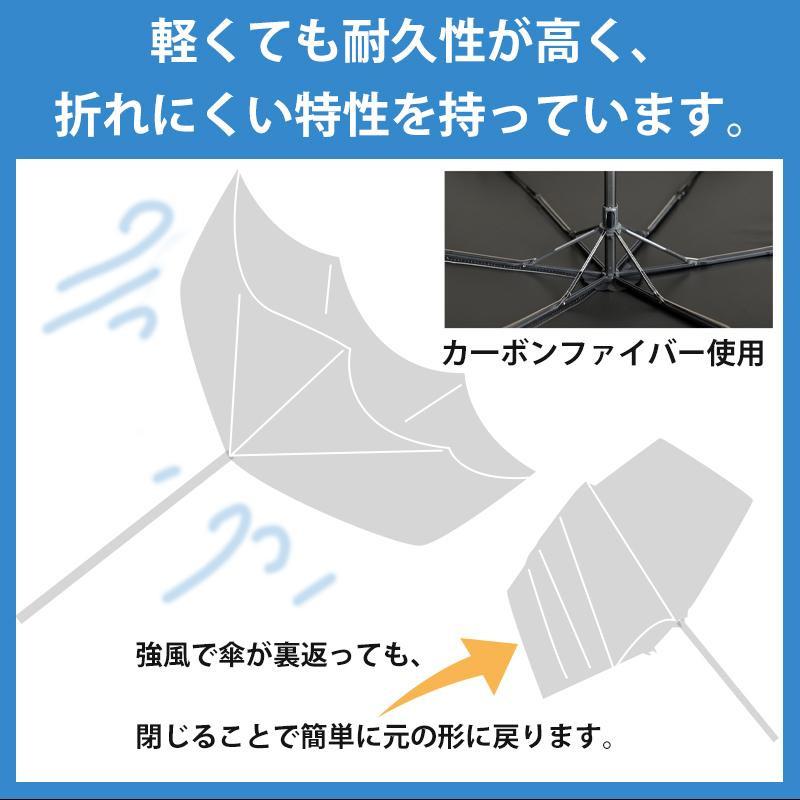 高密度撥水加工で、水玉が転がり落ちるように雨をはじきます。振るだけで簡単に水を払えるのでずっと清潔。中棒は炭素繊維素材で、軽量の割には強くて強風にも負けない頑強さを発揮します。