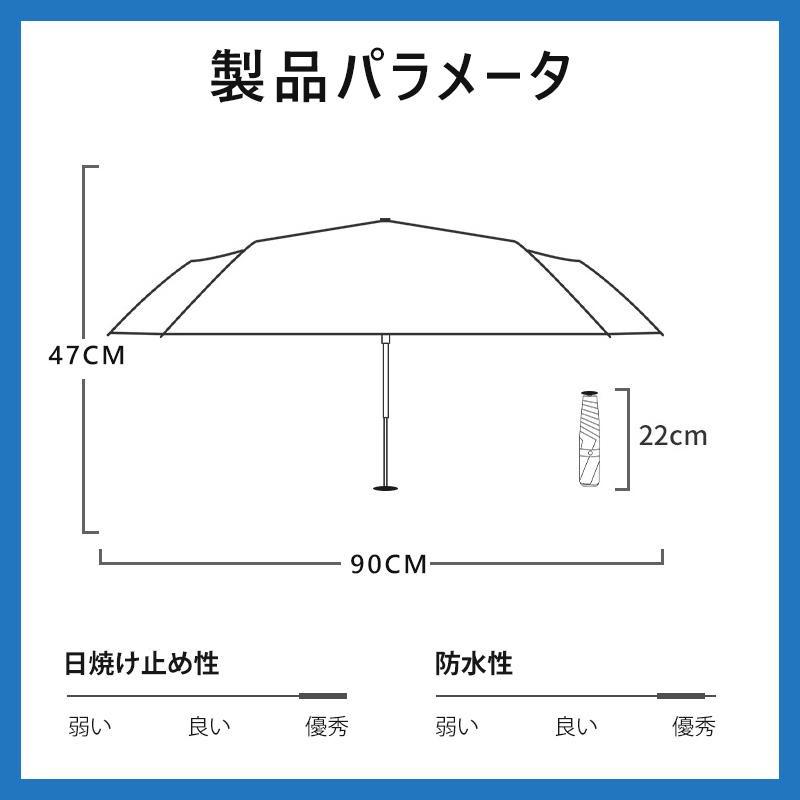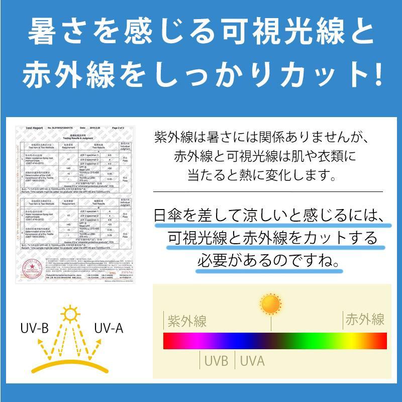 UVカット率100%、UPF50+の高い紫外線防止力で、真夏の直射日光からお肌を守ります。厳しい暑さ対策に最適な日傘です。