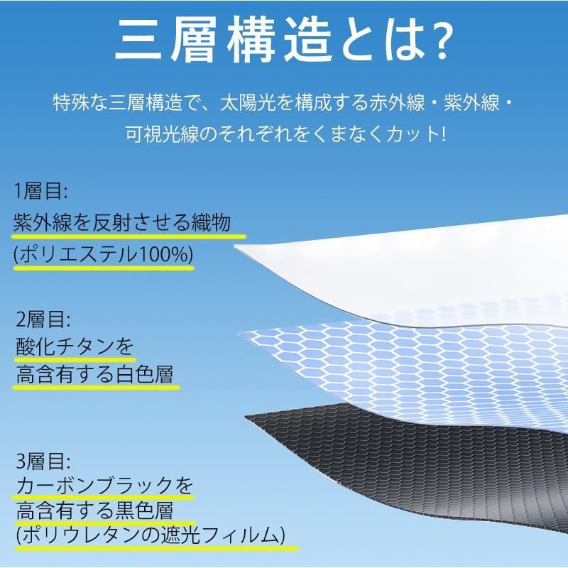 高密度の黒塗装された遮光生地と、熱線を反射するサンブロック生地の2重構造で、日差しと熱を徹底的にシャットアウト。