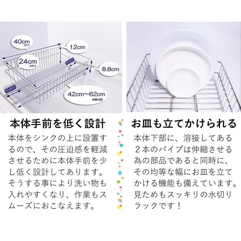 伸縮式による設置場所を選ばない汎用性、食器から落ちた水がシンクに直接排水される高い利便性と、「18-8ステンレス」による優れた耐久性を実現しました。