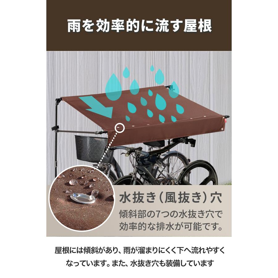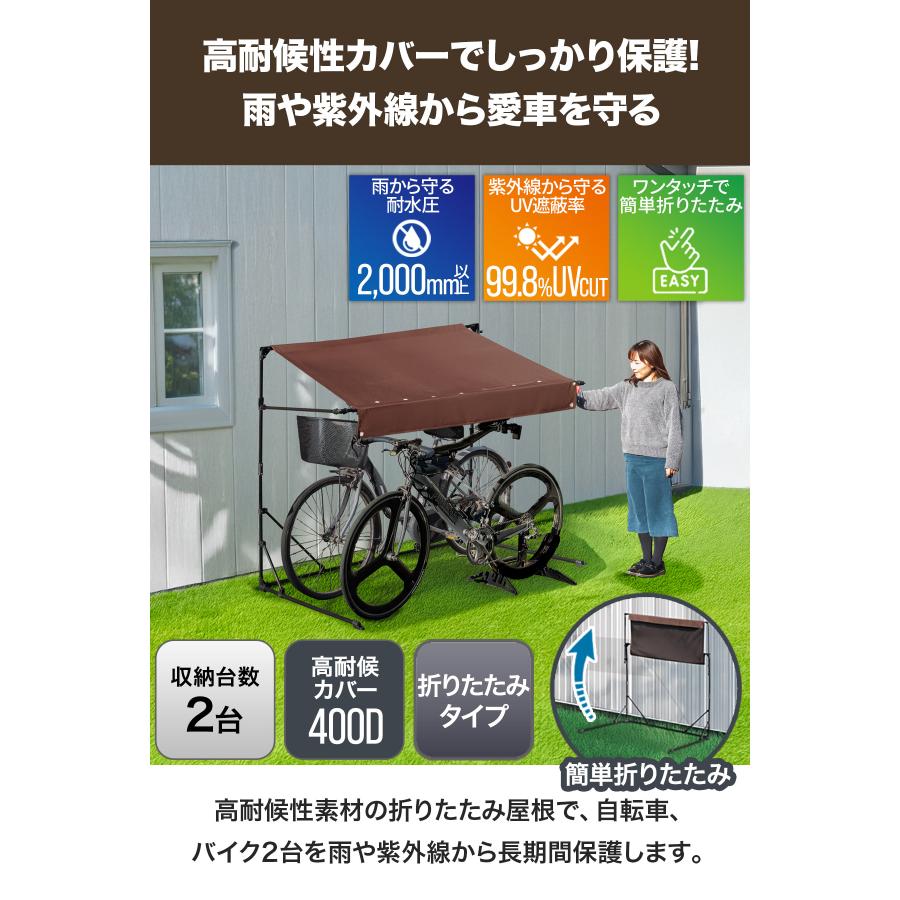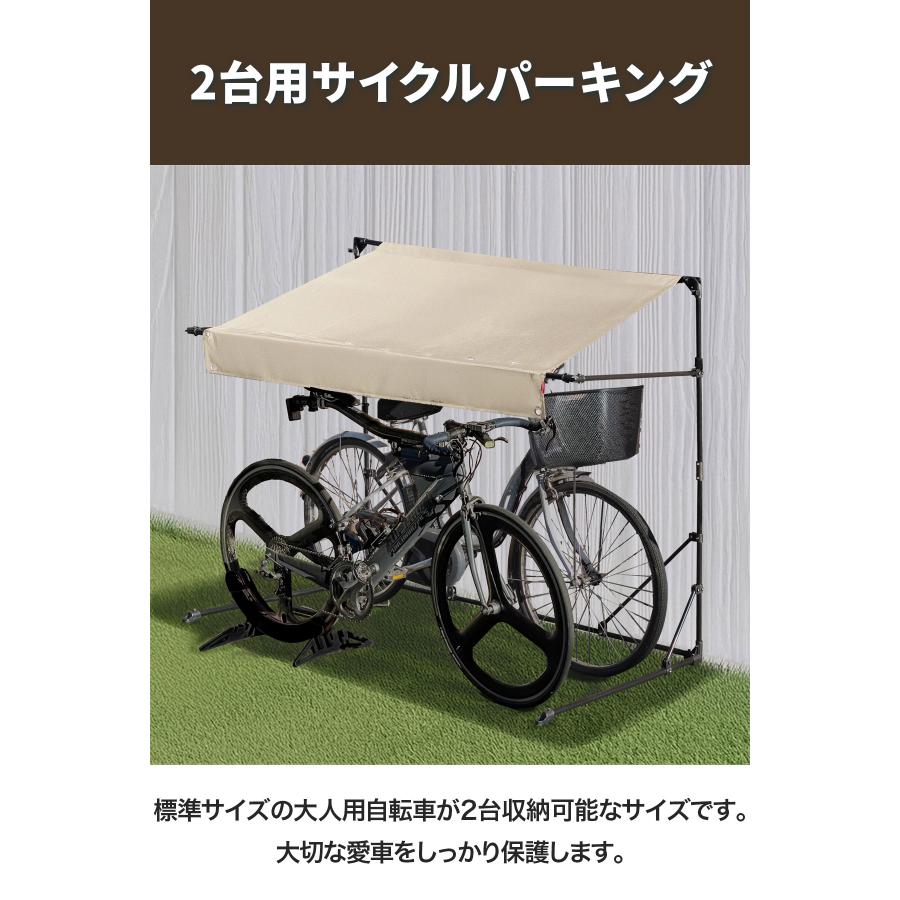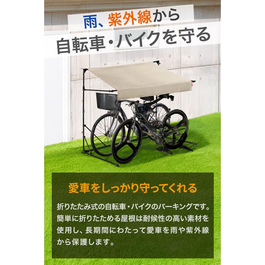 庇の長さ約105cm、標準サイズの大人用自転車が2台収納可能な折りたたみ式の自転車・バイクのパーキングです。