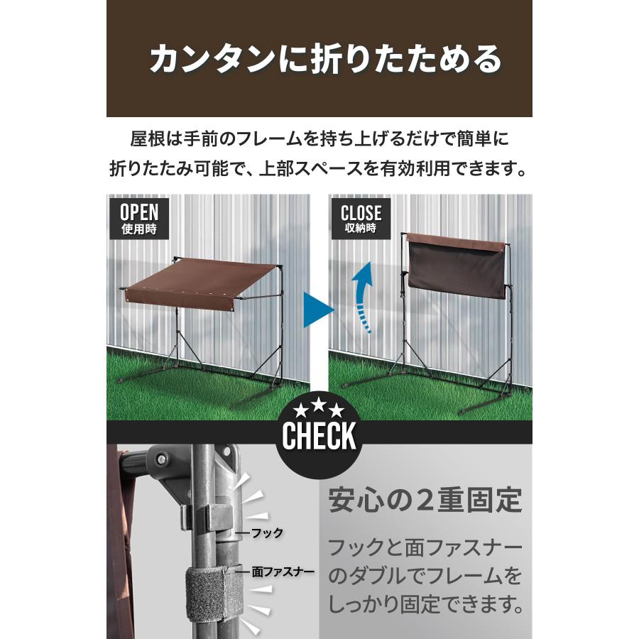 屋根は手前のフレームを持ち上げるだけで簡単に折りたため、スリムで上部のスペースを有効に使えます。