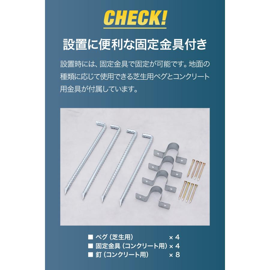 常設時は固定金具での固定が可能です。芝生用ペグとコンクリート用金具が付属しています。