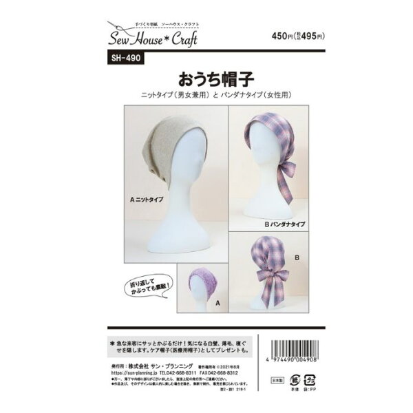 型紙 パターン おうち帽子 SH-490 SH490 フィットパターンサン サンプランニング 大人 子供 ベビー 赤ちゃん 作り方 洋裁