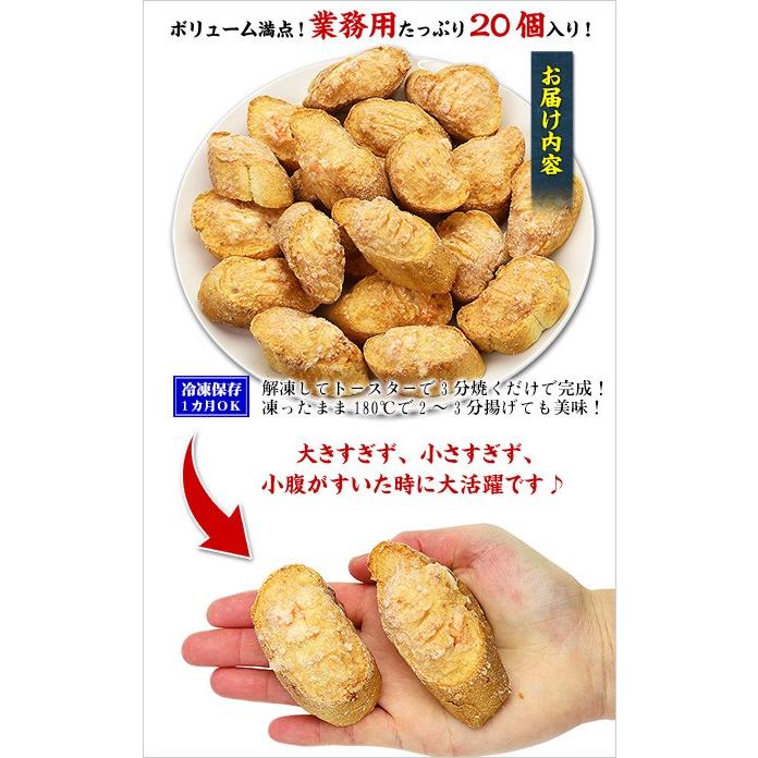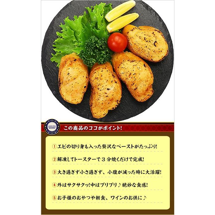商品のポイント:プリプリのエビで作ったペーストを、フランスパンの上にたっぷり乗せた「海老パン」をご紹介!丸々1尾ではございませんが、ゴロっとしたエビの切り身も入っていて、サクサクのフランスパンとの相性抜群!調理も簡単!解凍してトースターで3分焼くだけで完成です。パンの大きさは、大き過ぎず小さ過ぎず、二口くらいで食べられる絶妙な大きさで小腹が減った時に大活躍!外はサクサクッ!中はプリプリ♪ボリューム満点たっぷり20個入り!