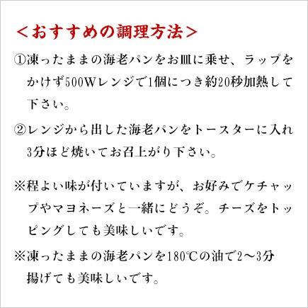お召し上がり方:凍ったままの海老パンをお皿に乗せ、ラップをかけず500Wレンジで1個につき約20秒加熱して下さい。レンジから出した海老パンをトースターに入れ3分程焼いてお召上がり下さい。※程よい味が付いていますが、お好みでケチャップやマヨネーズと一緒にどうぞ。チーズをトッピングしても美味しいです。