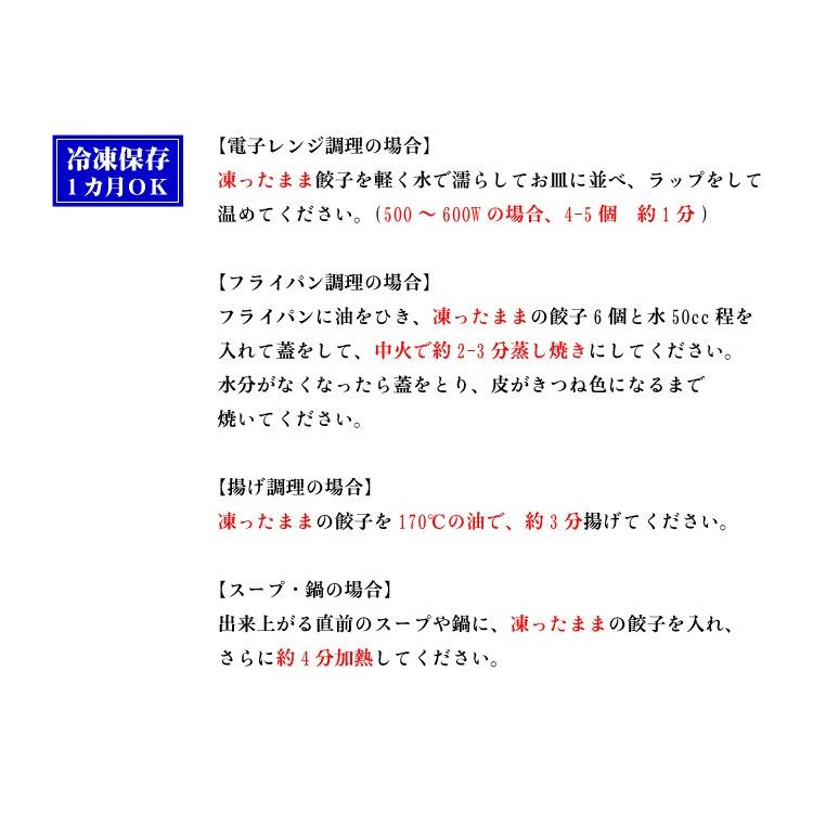 お召し上がり方:【電子レンジ調理の場合】凍ったままの餃子を軽く水で濡らしてお皿に並べ、ラップをして温めてください。(500〜600Wの場合、4-5個 約1分)
