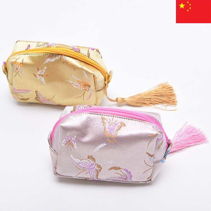 サテンポーチ 2個セット チャイナサテン メイクポーチ 刺繍 フリンジ 中国みやげ 中国土産 海外 雑貨