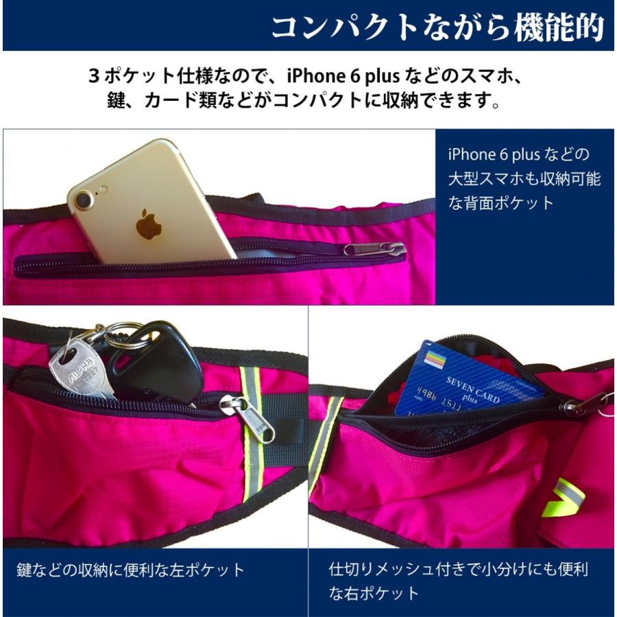 コンパクトながら大容量、3ポケット仕様なので、運動やアウトドアのシーンで500mlのペットボトル、スマホ、鍵などが収納可能です。