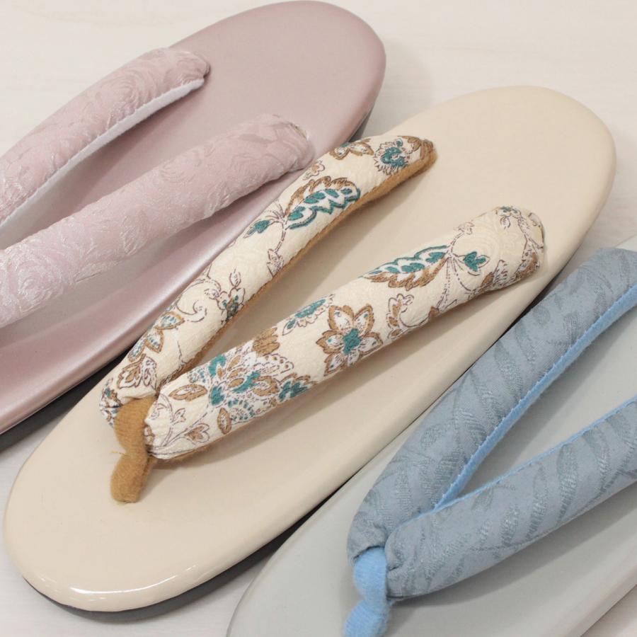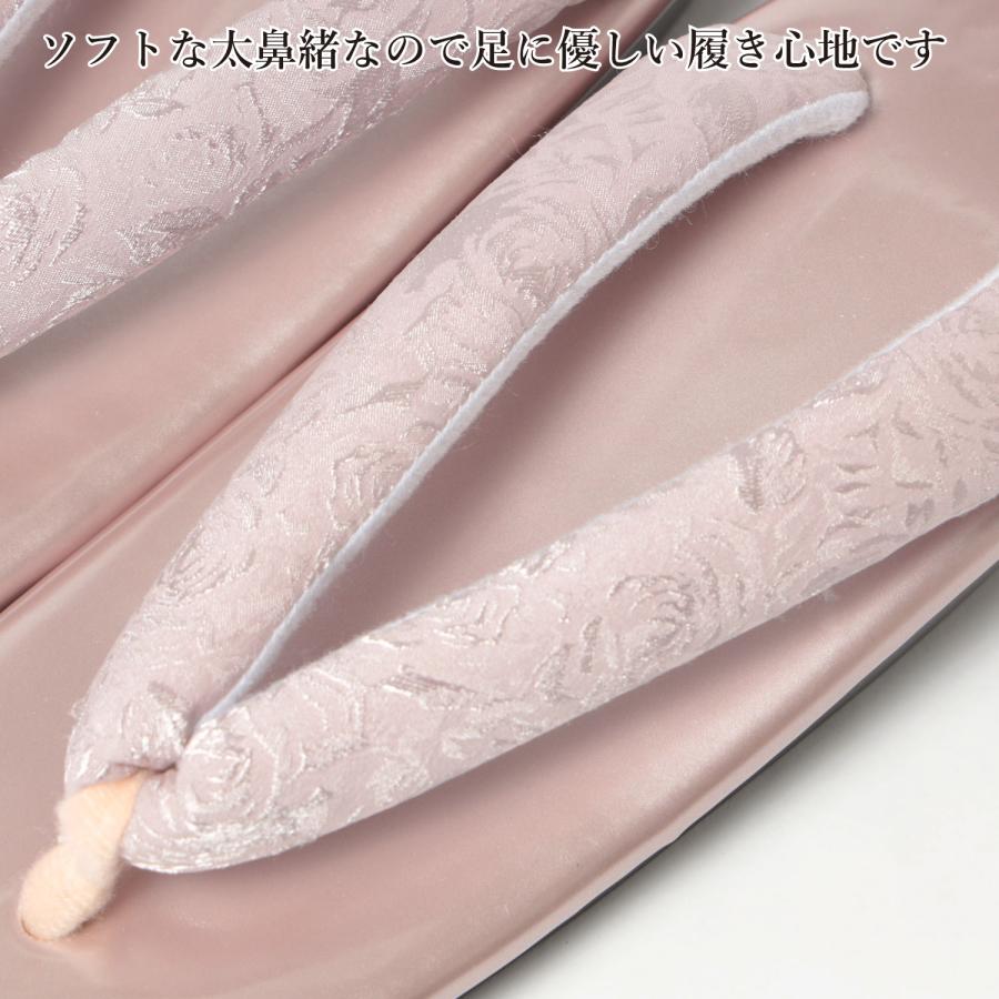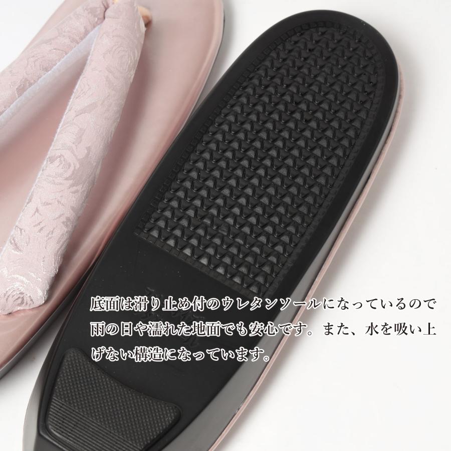 鼻緒にお洒落な地模様生地を使用したエレガントな女性用草履です。ふっくら柔らかく太目の鼻緒なので足当たりがソフトで履いていても痛くなりにくいのが特徴です。ソール(底面)はウレタン素材になっているのでクッション性があり丈夫で摩擦や水濡れなどにも強いです。底面は滑り止めの溝が入っていて底から水を吸い上げない構造になっています。卒業式の袴衣装や小紋、紬、洗える着物などの普段着物・街着などの着物にも最適です。