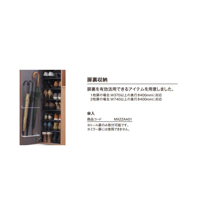 LIXIL 玄関収納 傘入 MXZZAA01扉裏を有効活用できるアイテムを用意しました。1枚扉の場合:W370以上の奥行き400mmに対応2枚扉の場合:W740以上の奥行き400mmに対応※トール扉のみ取付可能です。※ミラー扉には使用できません。