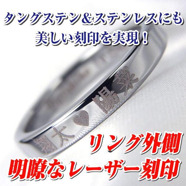 【外レーザー】のアイコンがあるリングには、リングの外側に明瞭なレーザー刻印のメッセージを刻むことができます。従来のケガキ刻印では対応できなかったタングステンリングやステンレスリングにも明瞭な刻印が可能となります。